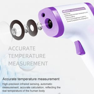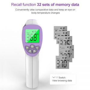 Инфрачервен термометър за бързо измерване на температурата на челото, с памет за 32 измервания. Екранът променя цвета си при измерена температура, която не е в нормите. Оптимално разстояние за измерване между 5 и 15см.